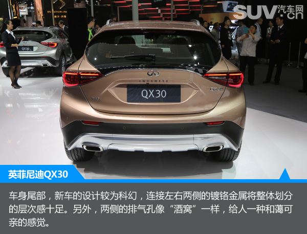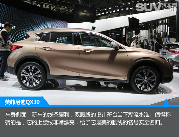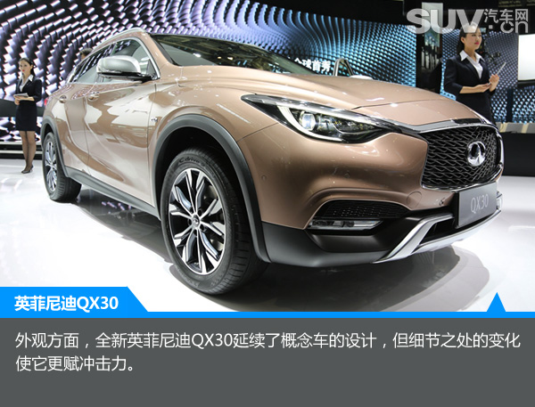 两年一度的北京车展如约而至了,在本届车展上,SUV车型极其火爆。当然,随着国内SUV市场的井喷,越来越多的厂家的开始细分市场。在豪华品牌SUV方面,奔驰、宝马、奥迪早已经抢占市场,而我们今天的主角同样是豪华品牌,它就是全新英菲尼迪QX30。它的出现可使消费者在选择豪华品牌SUV车型时,有更多的选择。下面,我们一起来看下全新英菲尼迪QX30
