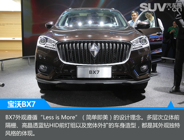 BX7外观遵循“Less is More”(简单即美)的设计理念。多层次立体前隔栅、高晶透蓝钻HID前灯组以及宽体外扩的车身造型,都是其外观独特风格的体现。