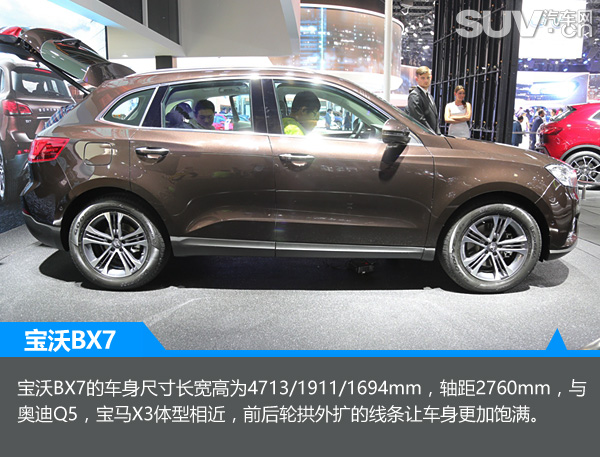 宝沃BX7的车身尺寸长宽高为4713/1911/1694mm,轴距2760mm,与奥迪Q5,宝马X3体型相近,据官方介绍今后会提供5座,6座和7座款式。