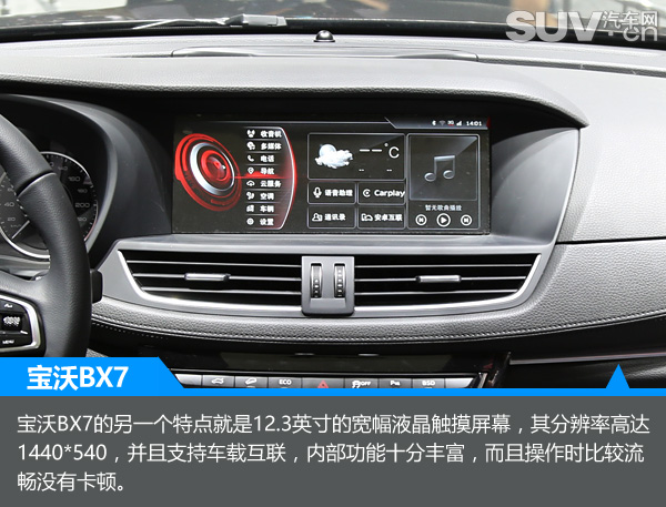 宝沃BX7的另一个特点就是12.3英寸的宽幅液晶触摸屏幕,其分辨率高达1440*540,并且支持车载互联,内部功能十分丰富,而且操作时比较流畅没有卡顿。