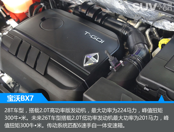 BX7上市的7款车型都为28T车型,其搭载的是2.0T高功率版发动机,最大输出功率为224马力,峰值扭矩为300牛·米。未来的26T车型搭载的2.0T低功率发动机的最大输出功率为201马力,峰值扭矩同样为300牛·米。传动系统与发动机匹配的是带有运动模式的6速手自一体变速箱。