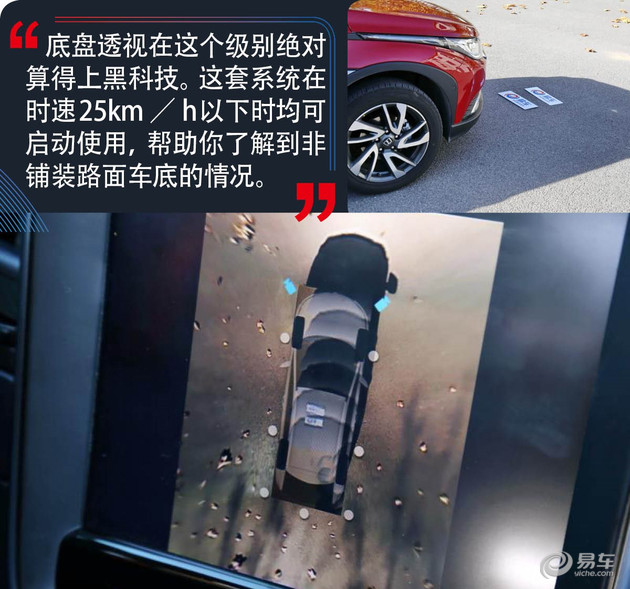 如果你认为自动泊车出现在这个级别仍然不够震撼,那么底盘透视这个黑科技绝对能让人惊讶。这套底盘透视系统在时速25km/h以下时均可启动使用,在通过一些复杂路面的时候,你可以通过中控液晶屏随时查看车身底部的图像,助力你通过障碍。